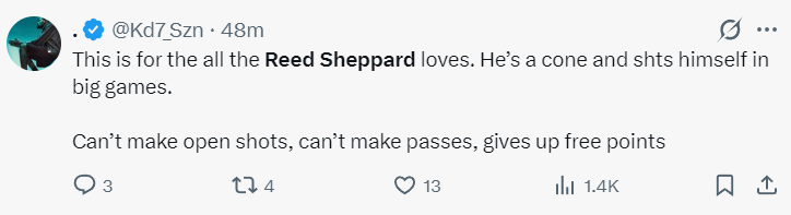 休媒疯狂朝着谢泼德开炮,Roosh:里德-谢泼德是个超级的防守漏洞,有时看着他打球真是让人难受。